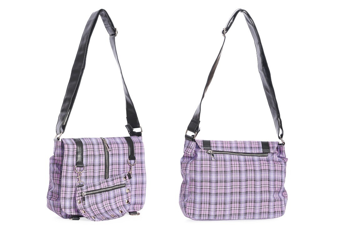 Lilac Tartan Twice The Action Messenger Bag - This unusual and unique tartan bag is covered with "punk" styling and also is available in 5 different gorgeous colours. The bag features a mini flap with a small pocket, an adjustable strap, a zippered opening and pockets. Plenty of room for all your essentials and more. Made from 90% Polyester and 10% PVC.