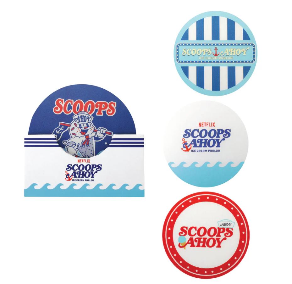 Protect your table top in style with our vintage-inspired Scoops Ahoy coasters. Capturing the charm of the beloved ice cream parlor from the hit series, these coasters bring a touch of nostalgia to any home or table top.