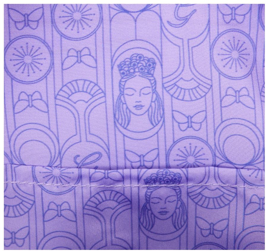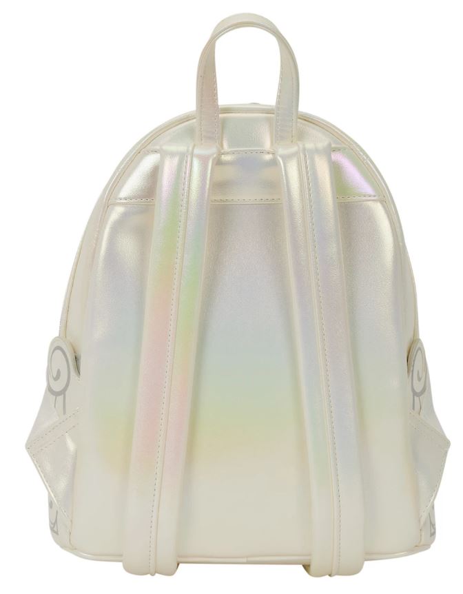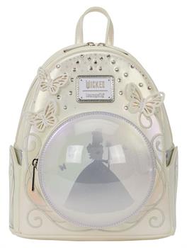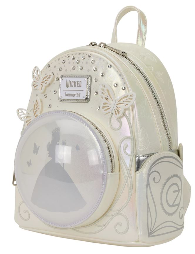 This gorgeous mini backpack features pearlescent faux leather with elegant details, including silver foil, rhinestones, and raised tonal embroidery. Over the front pocket, you'll find a clear PVC bubble with Glinda inside it! Butterflies and swirling designs cover the bag.