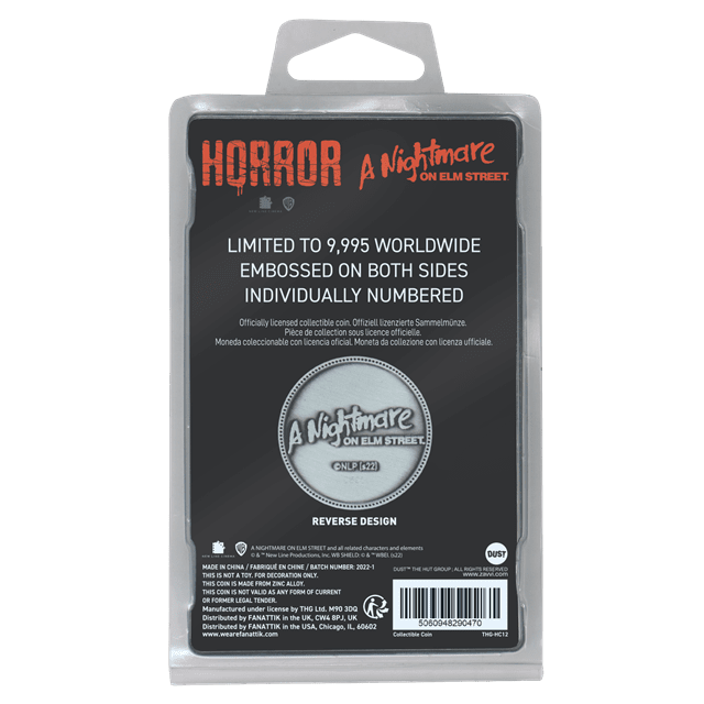 Freddy comes from your nightmares and on to this double sided heavily embossed Fanattik collectible coin. Limited to only 9,995 worldwide and individually numbered, this coin is 38mm in diameter and supplied within a protective acrylic cup within it's display pack.