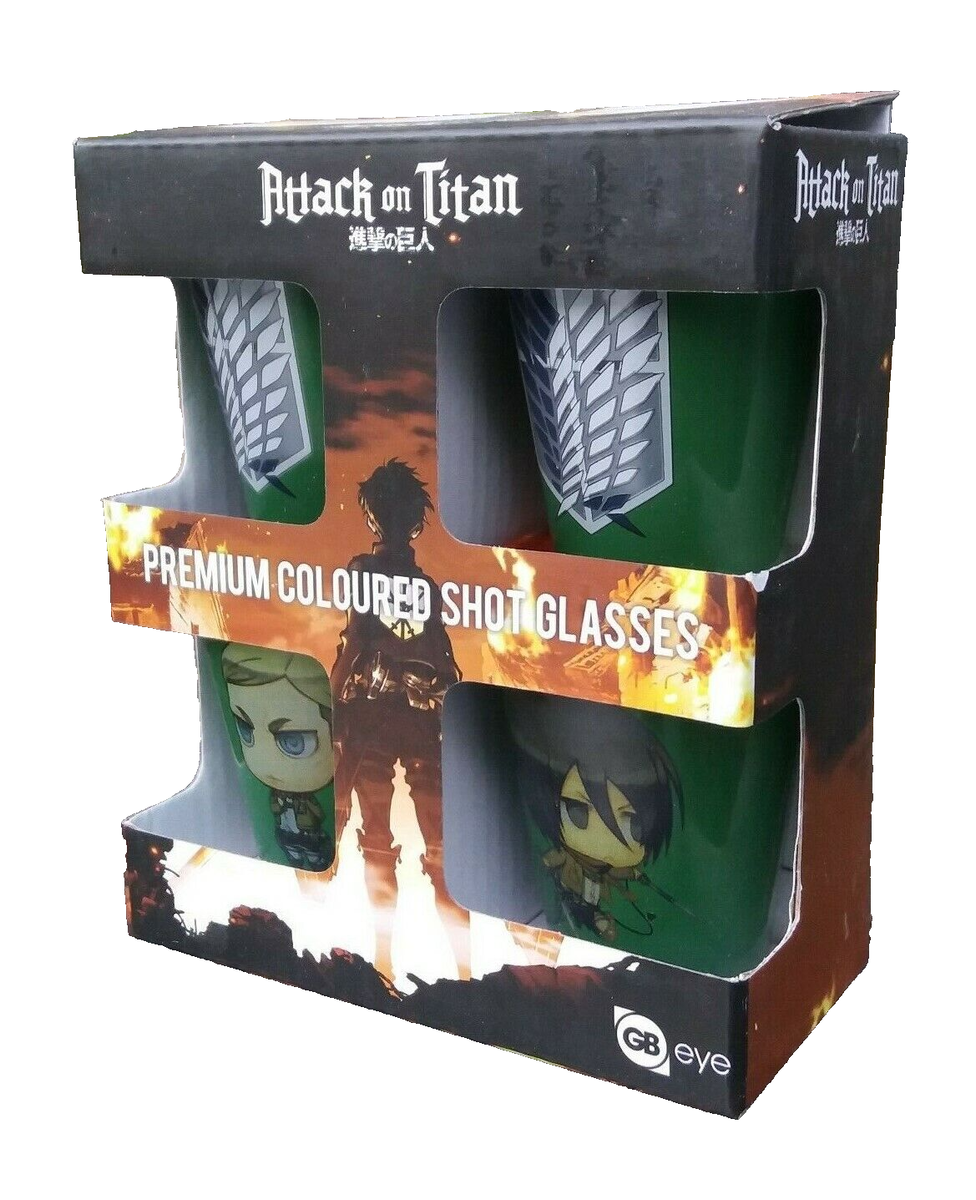 Set of four Official Attack on Titan shot glasses. These shot glasses are perfect for collectors and fans of the popular anime series.