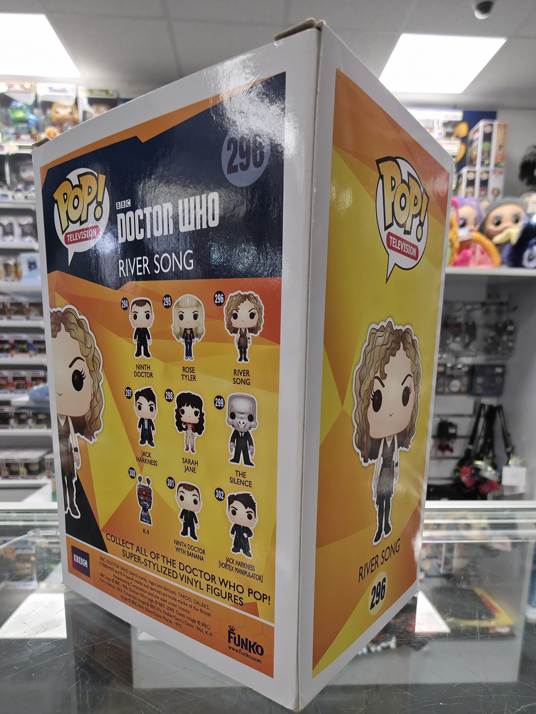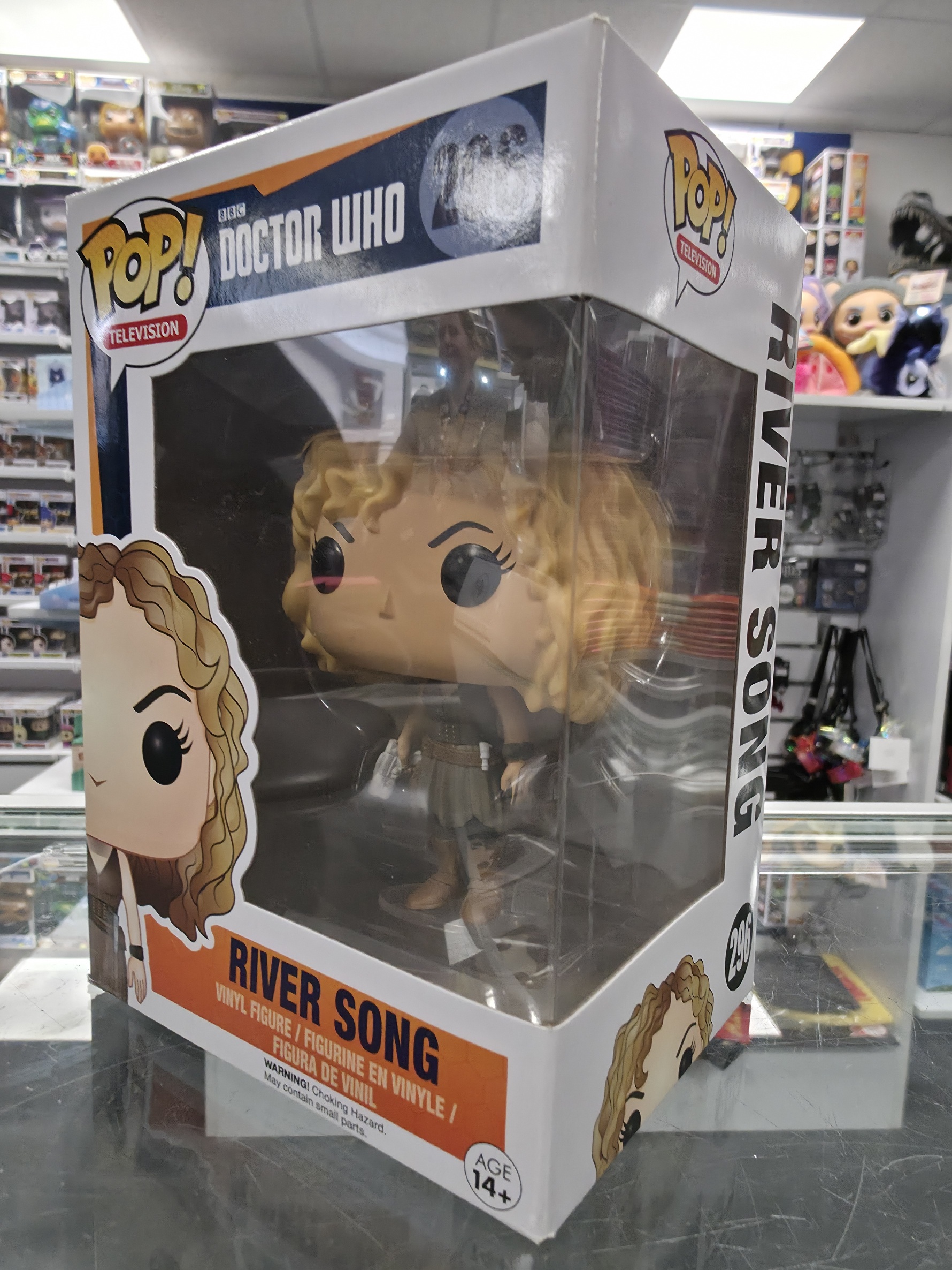 This Pre Loved Doctor Who: River Song 296 Funko POP! Vinyl Figure comes packaged in its original window display box and it's in good condition.