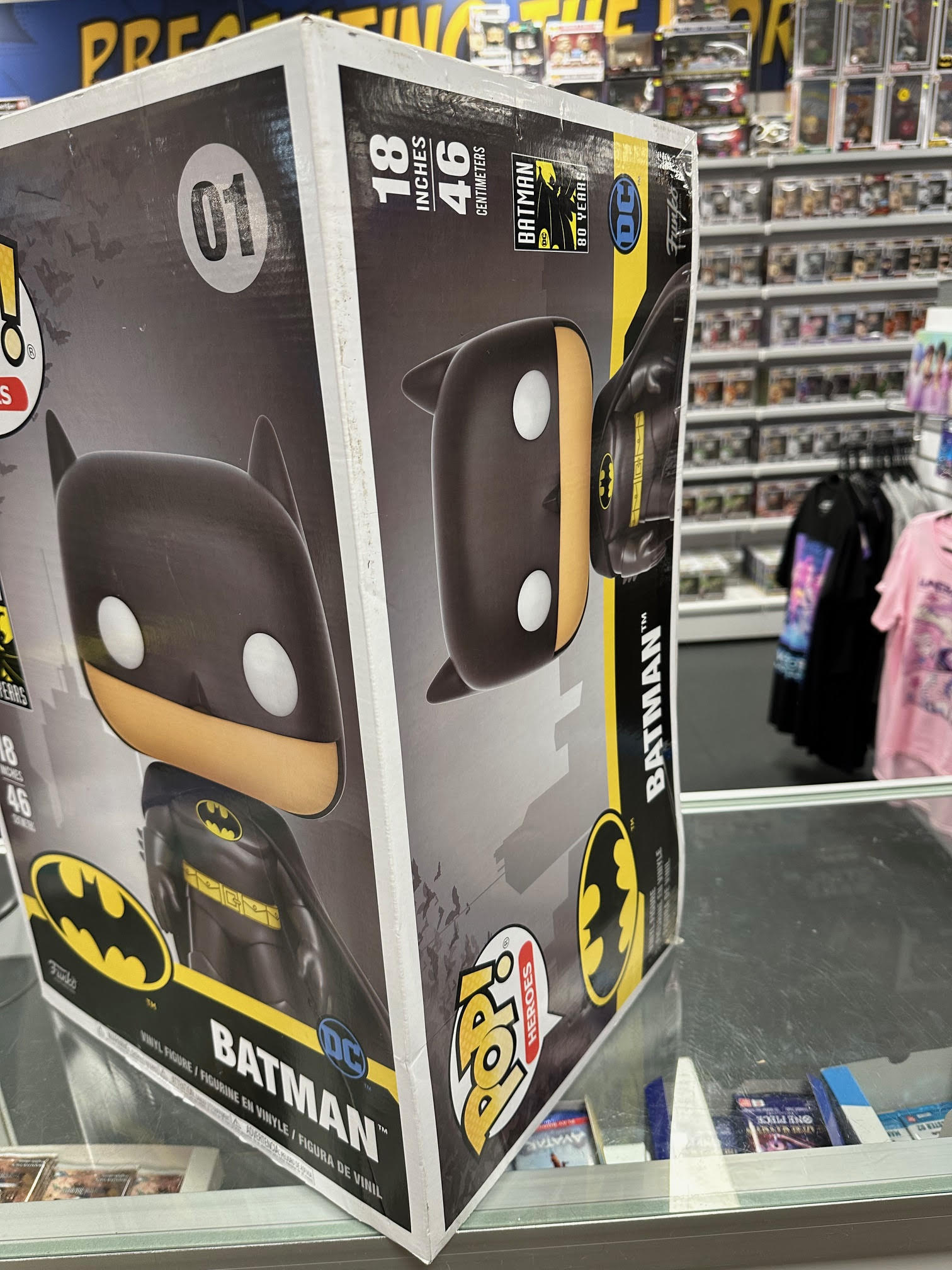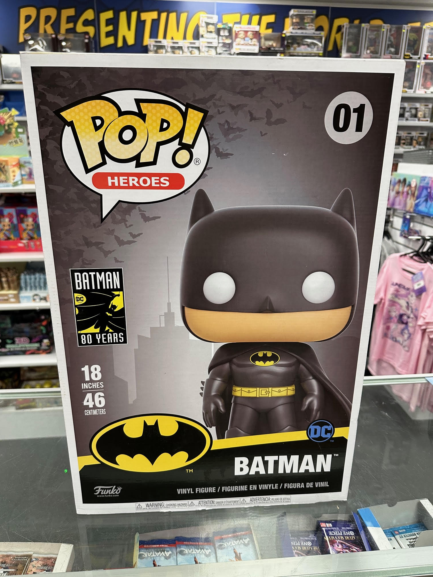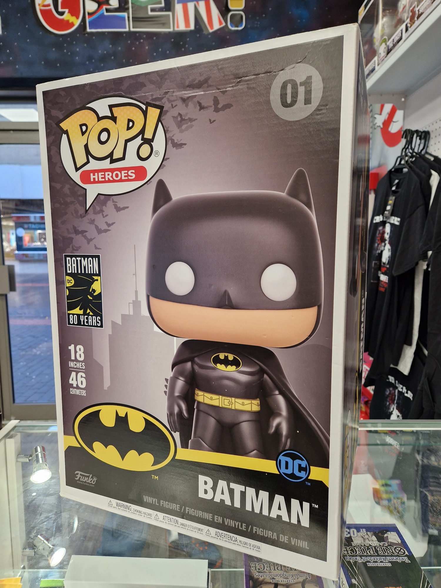 This Pre Loved Heroes: DC- 18" Batman Funko POP! Vinyl Figure comes packaged in its original window display box and it's in good condition.