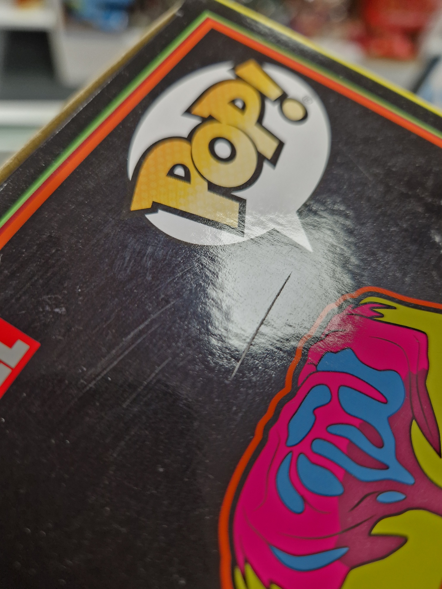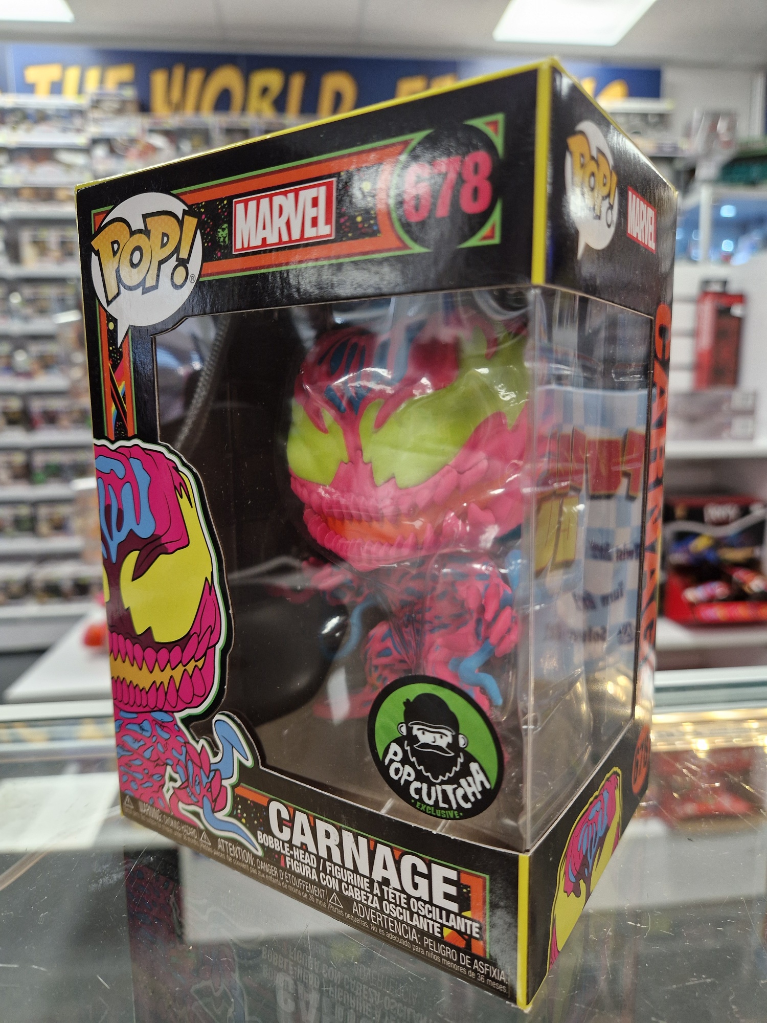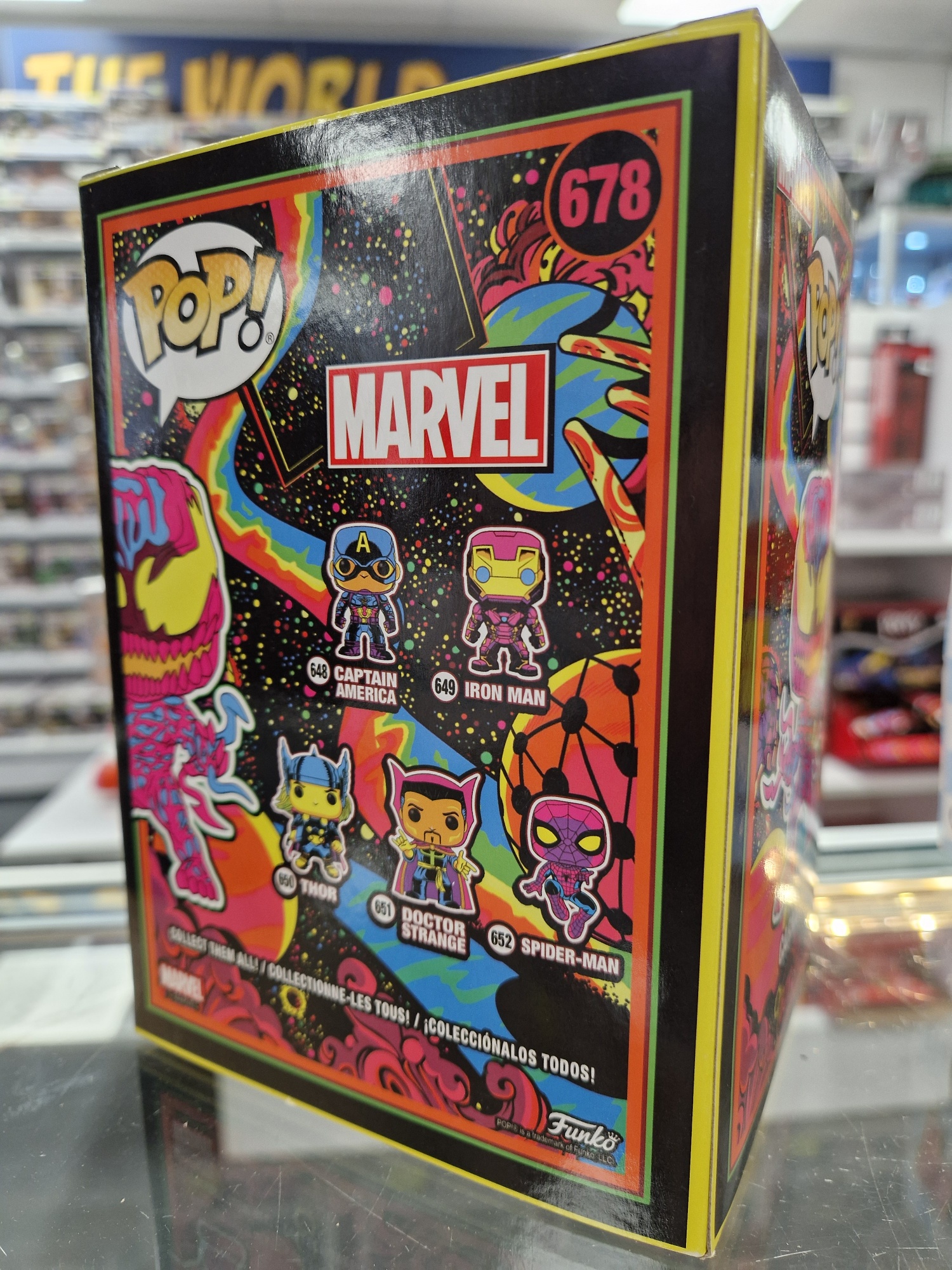 This Pre Loved Marvel: Carnage Blacklight Funko POP! Vinyl Figure comes packaged in its original window display box and it's in good condition.