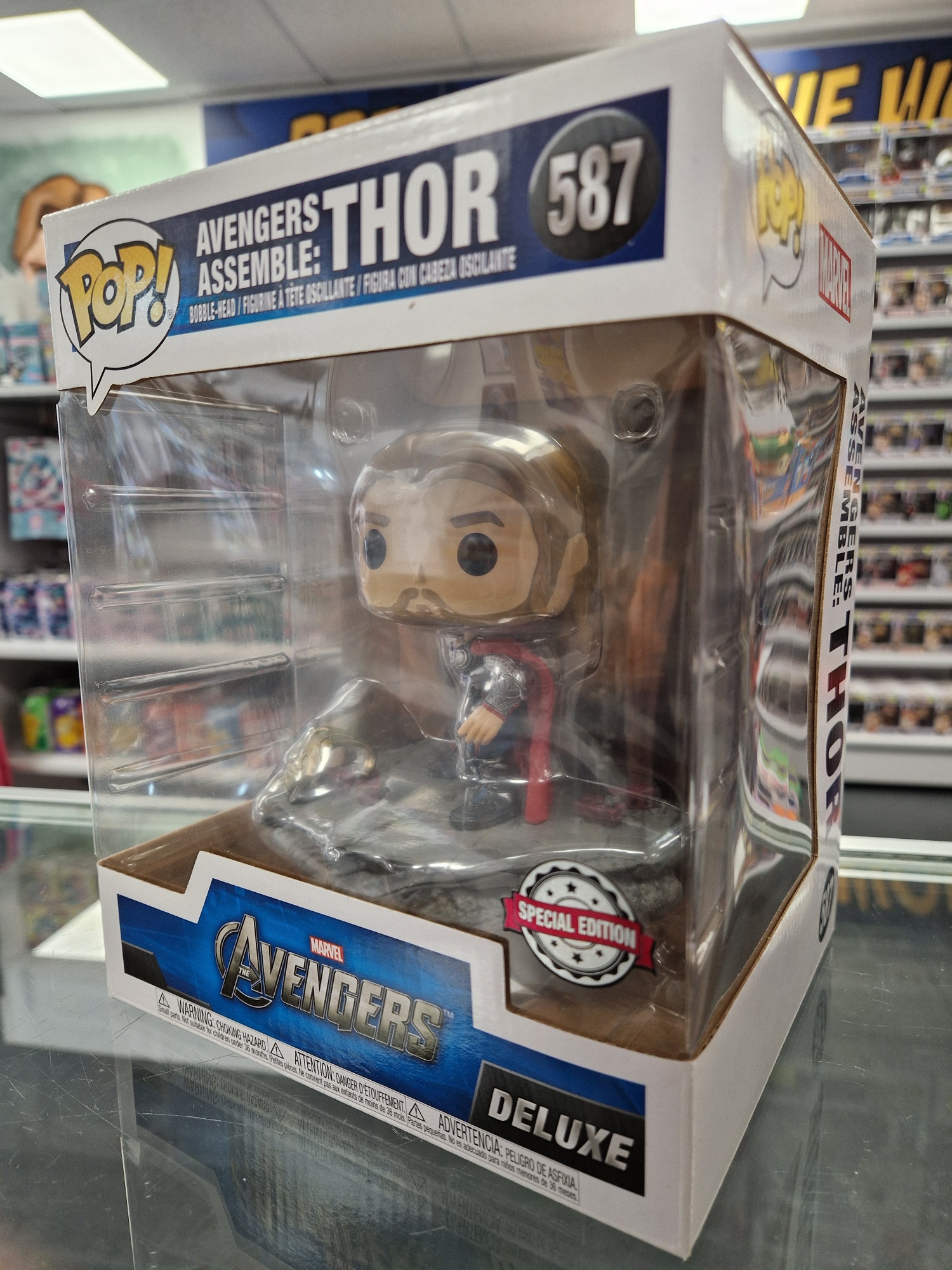This Pre Loved Deluxe: Avengers Assemble - Thor Funko POP! Vinyl Figure comes packaged in its original window display box and it's in good condition.