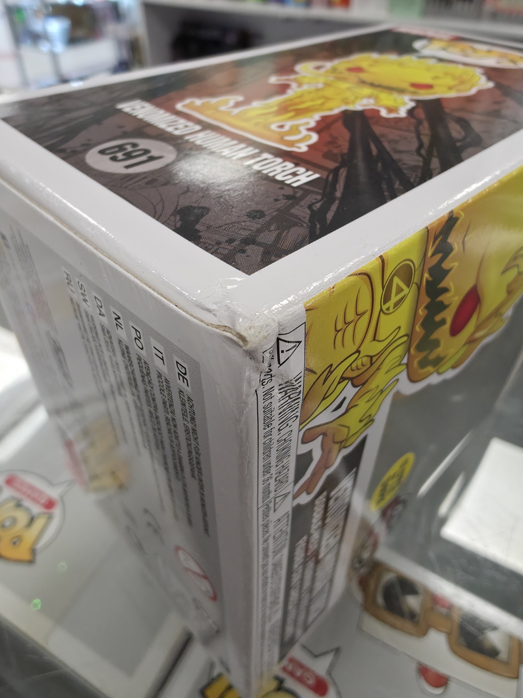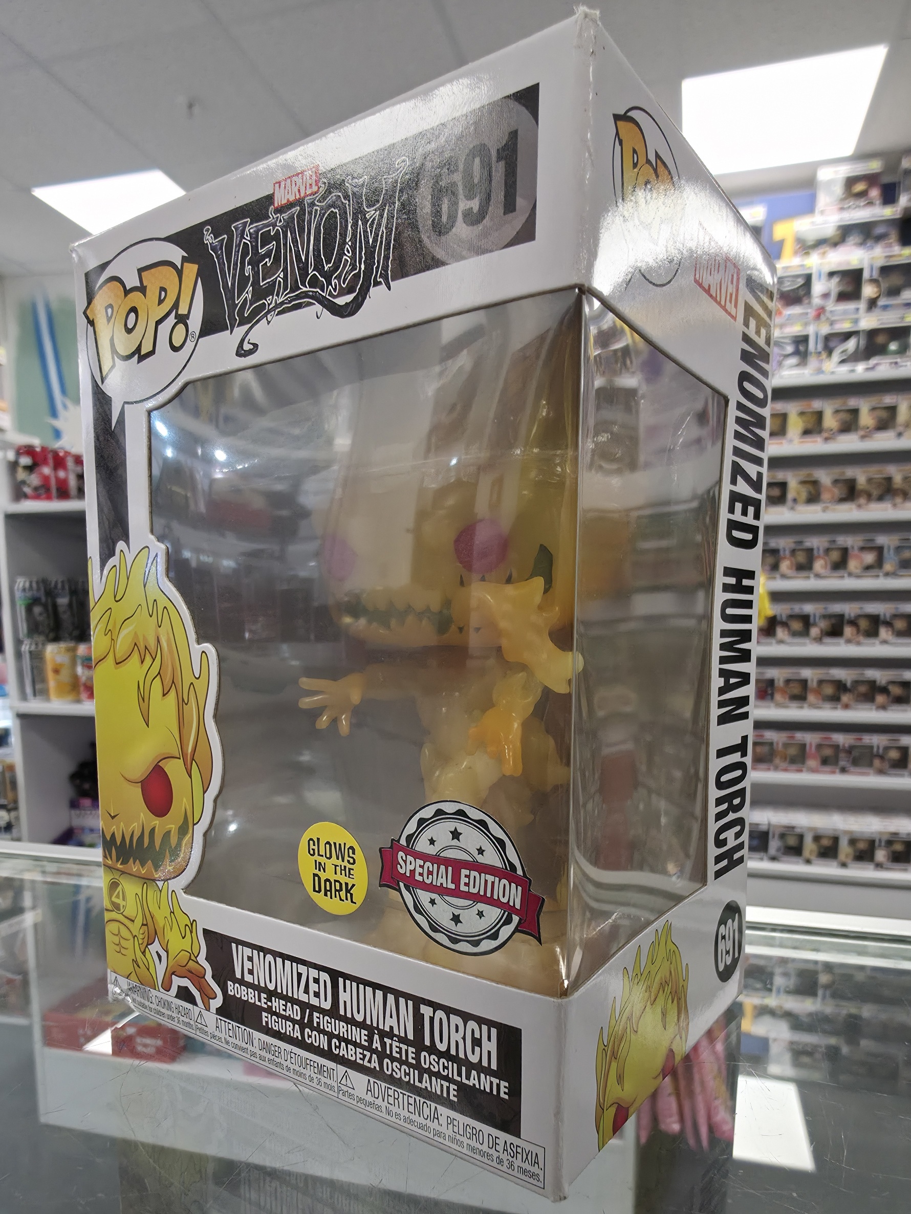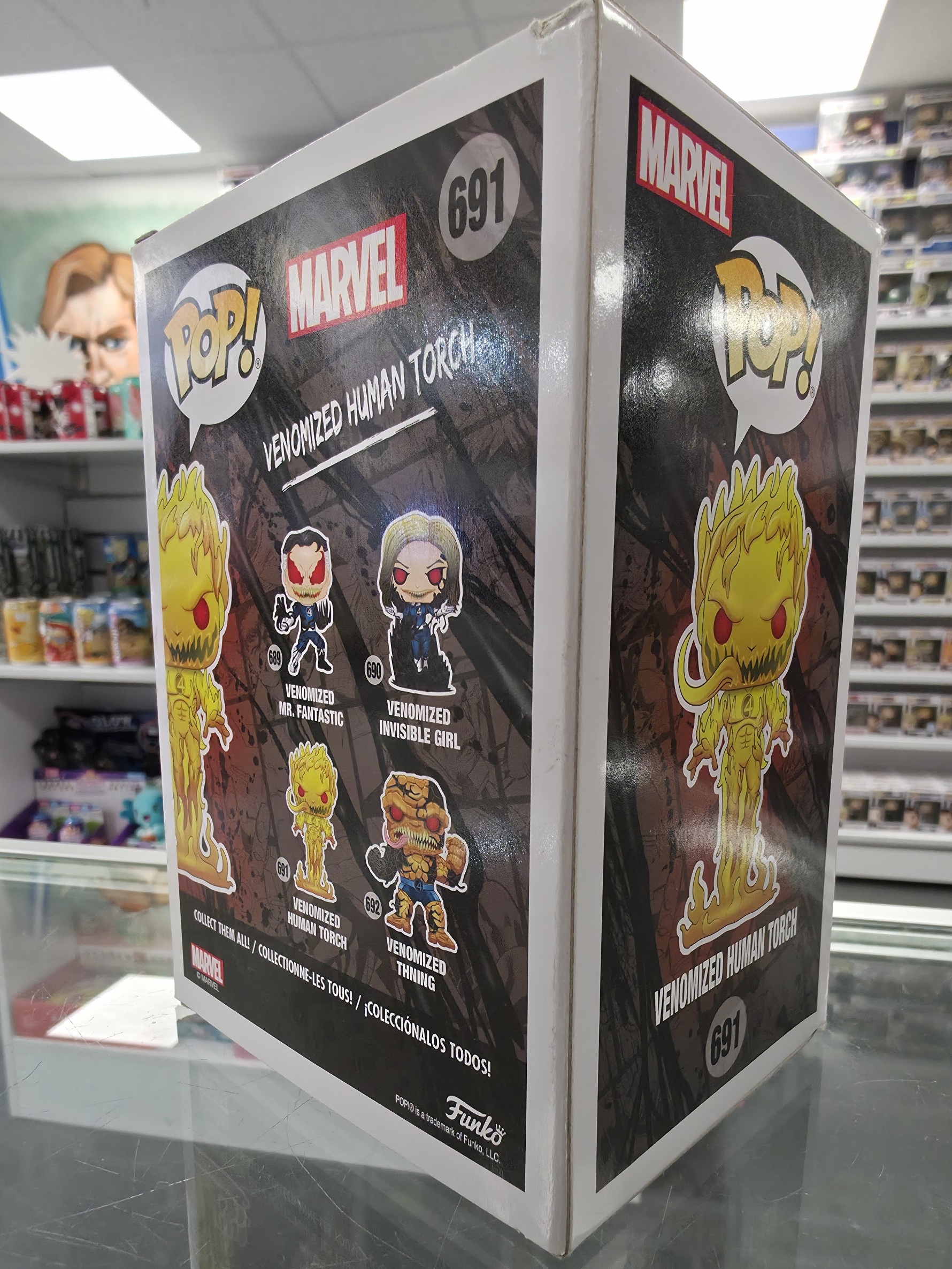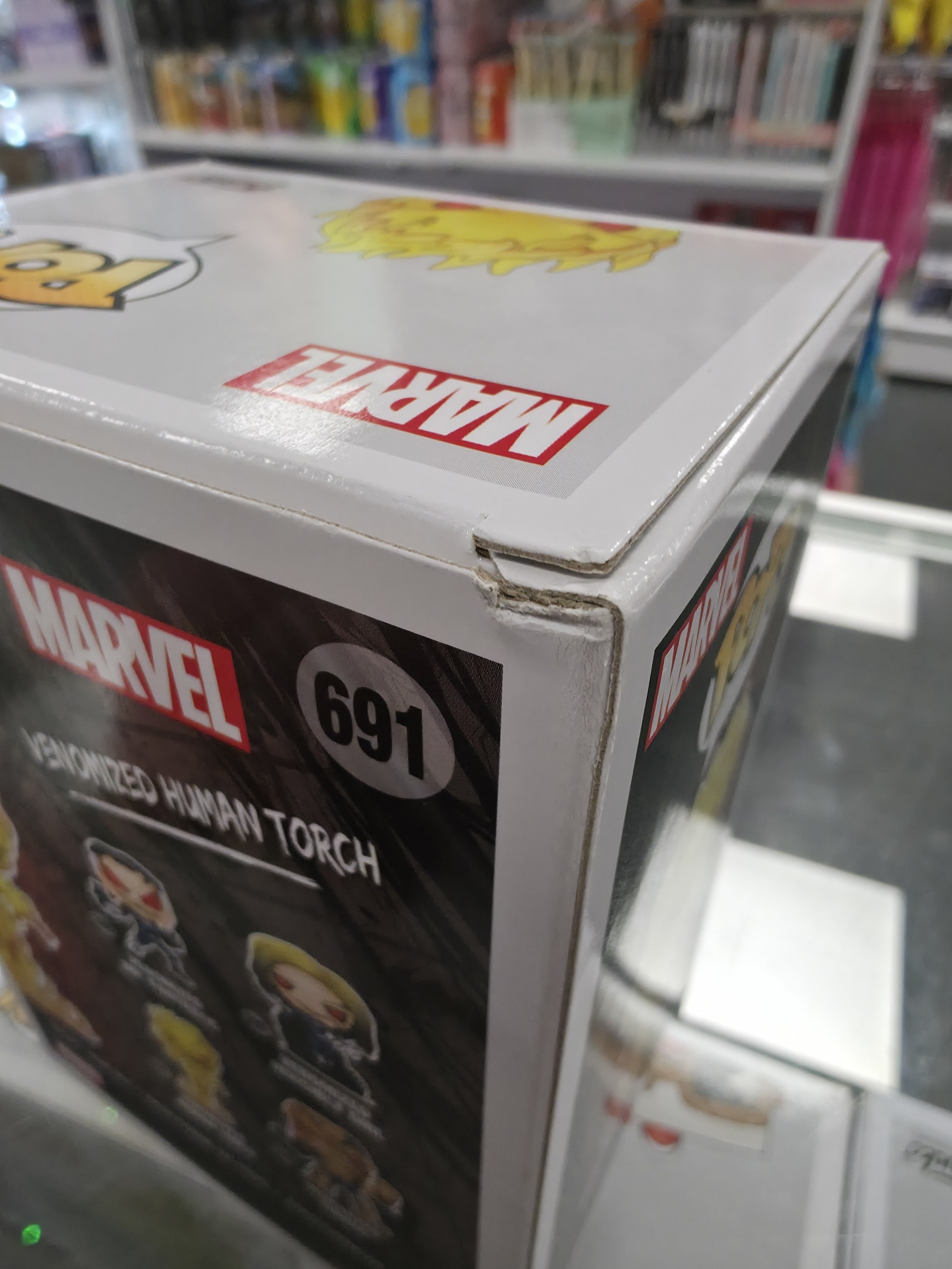 This Pre Loved Marvel: Venom: Venomized Human Torch (GITD) Funko POP! Vinyl Figure comes packaged in its original window display box and it's in fair condition.