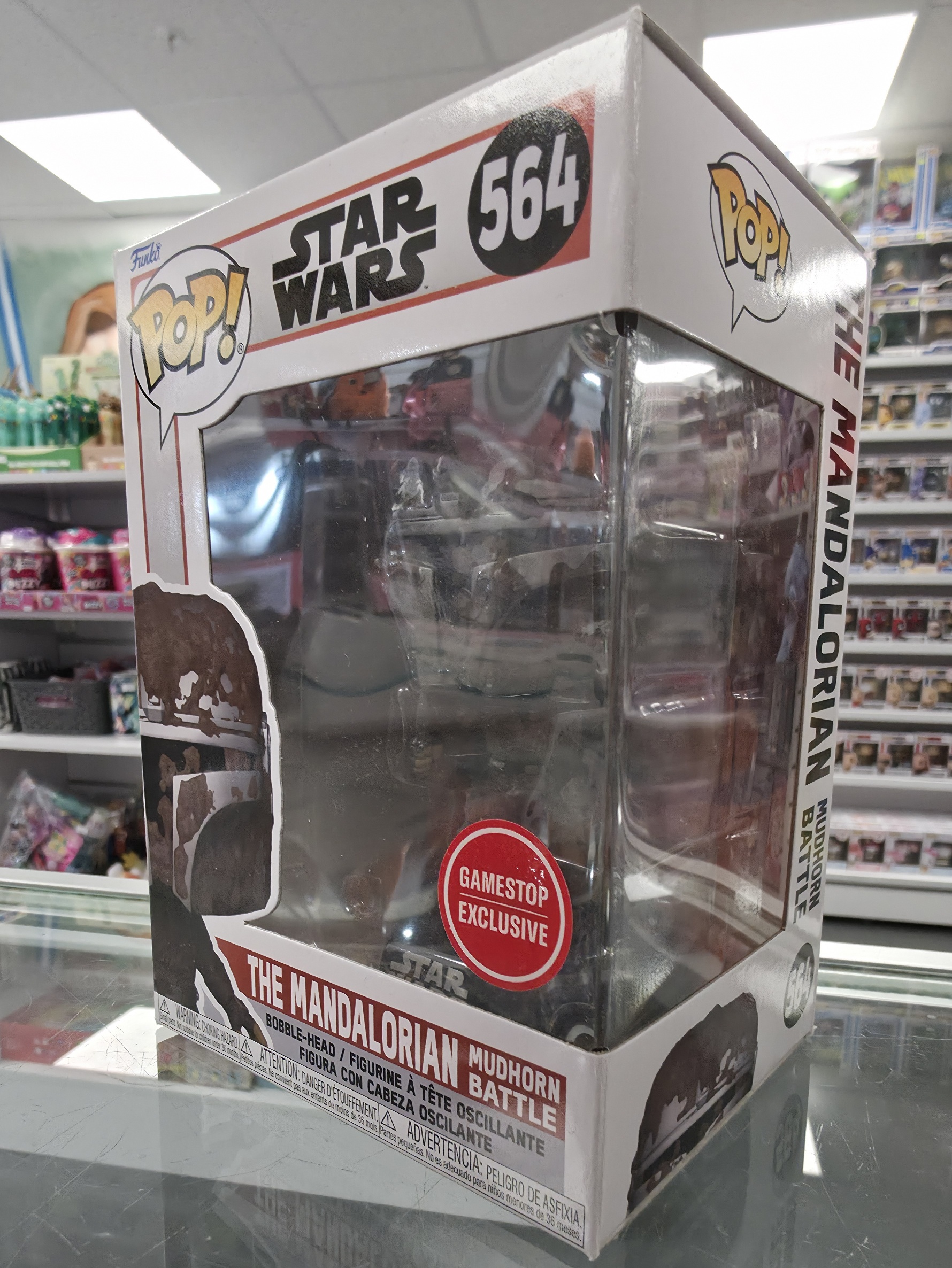 This Pre Loved Star Wars Mandalorian Mudhorn Battle 564 Funko POP! Vinyl Figure comes packaged in its original window display box and it's in good condition.