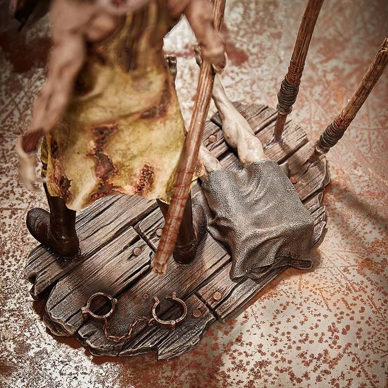 Only those without fear choose to stand in the face of the Red Pyramid Thing! Dragged forth from the sinister world of Silent Hill 2, he stands upon a themed floorboard base at 11.6“ (29.5cm) with a spear in hand. Additional props including the corpse of a recent victim, shackles and broken spears within the base enable this replica to truly capture the bloodcurdling presence of this horrific creature. For any Silent Hill fan, this outstanding statue is a must-have addition to their collection!
