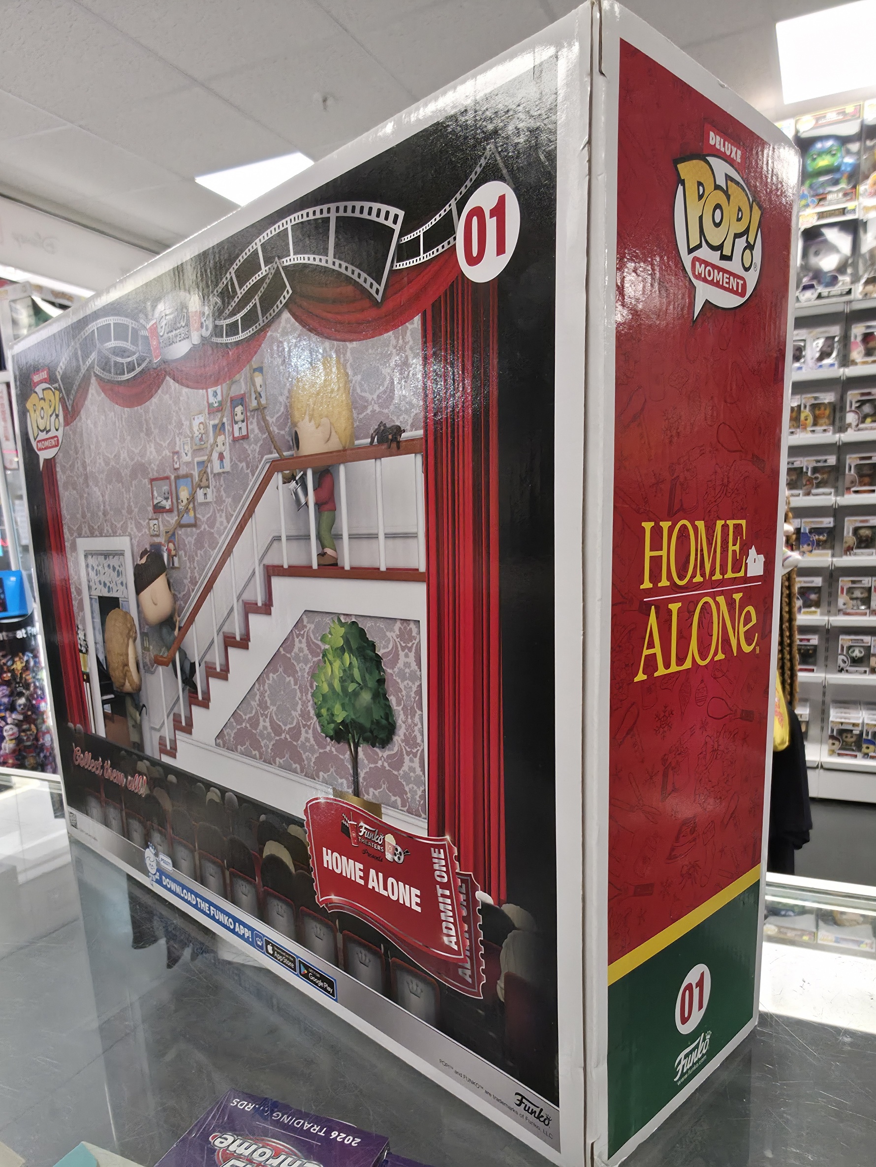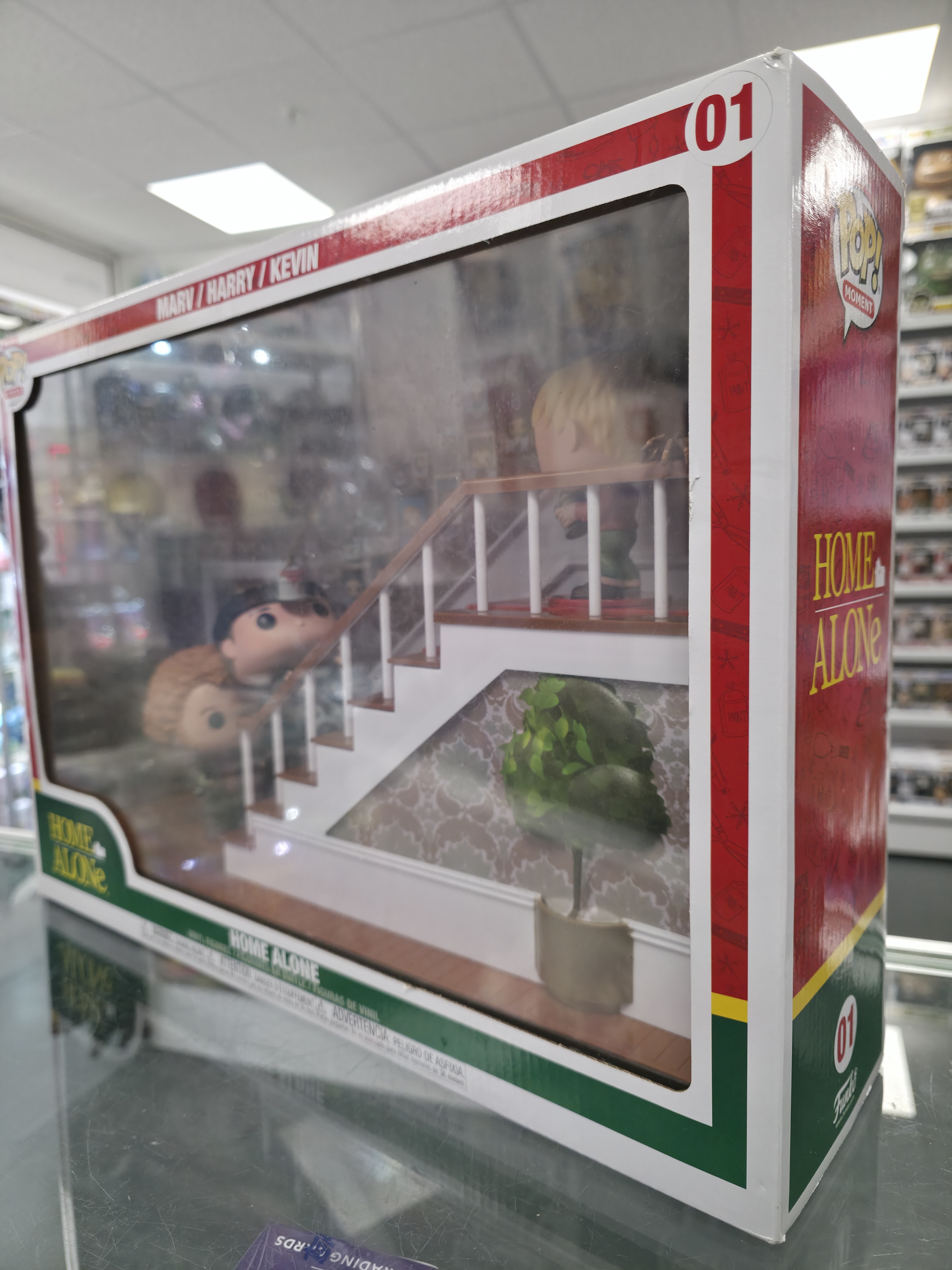 This Pre Loved Home Alone Stairs Scene 01 Funko POP! Vinyl Figure comes packaged in its original window display box and it's in fair condition.