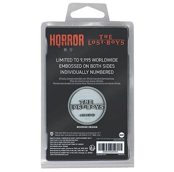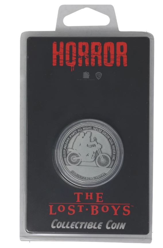 Joel Schumachers classic The Lost Boys are now on this double sided heavily embossed Fanattik collectible coin. Limited to only 9,995 worldwide and individually numbered, this coin is 38mm in diameter and supplied within a protective acrylic cup within it's display pack.