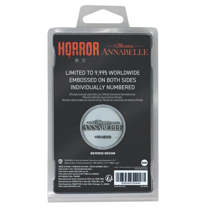 Annabelle can be seen on our embossed double-sided coin. Limited to only 9,995 worldwide and individually numbered, this coin is 38mm in diameter and supplied within a protective acrylic cup within its display pack. The re-sealable packaging that the Coin comes in is made in the UK from recycled material and is also fully recyclable.