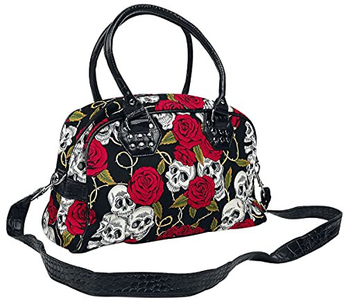 A fabulous stand out design from Banned Apparel. this handbag will get heads turning! A modern take on a classic skull & roses design full of gothic punk charm and character.