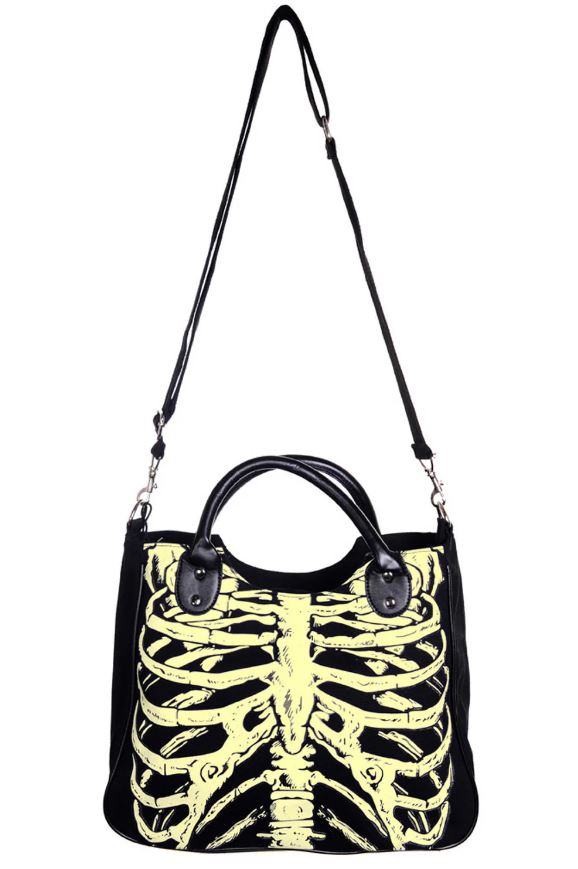 Spooky, scary handbag. This glow in the dark tote style handbag is the perfect place to keep all your emo belongings. Because who doesn't dream of keeping their makeup bag inside a disembodied rib cage?