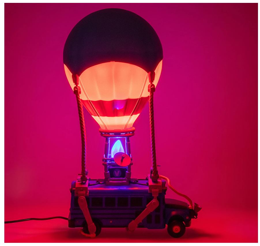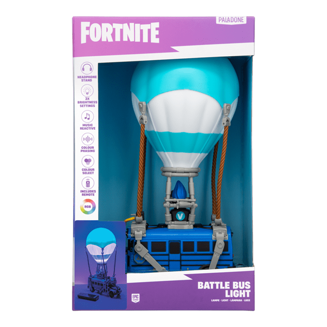 The Fortnite Battle Bus Diorama Lamp is a detailed reconstruction of the iconic vehicle from the game Fortnite. The lamp has three adjustable brightness levels and offers an interactive mode with music, making it ideal for gaming enthusiasts and children aged 6 and up. Measuring L 14.8 x W 19 x H 32 cm, it is perfect for both decoration and functional lighting in the home.