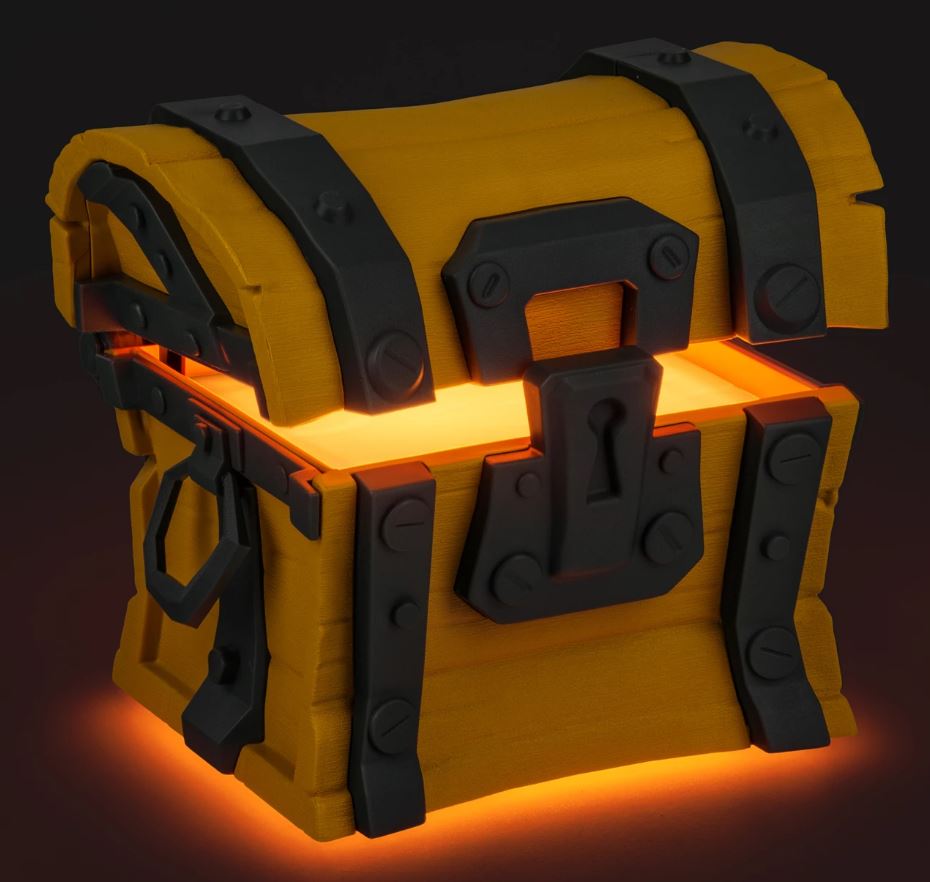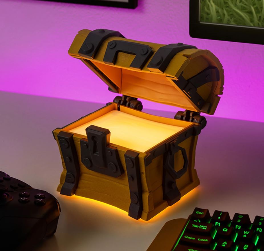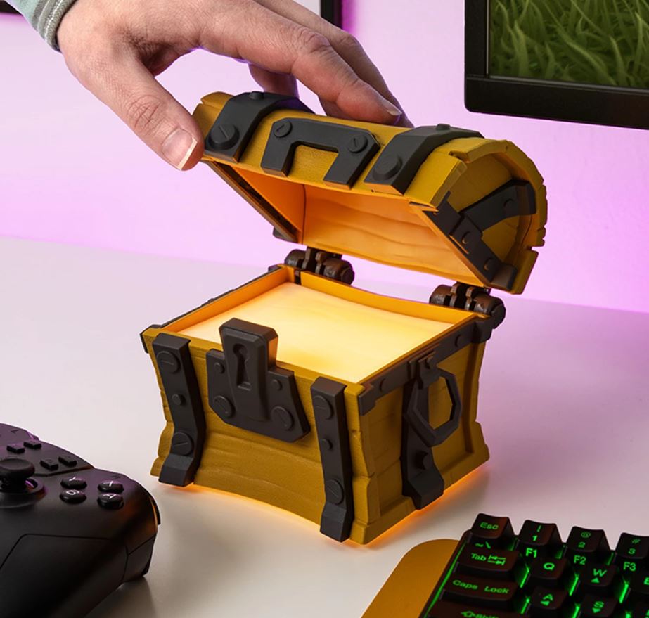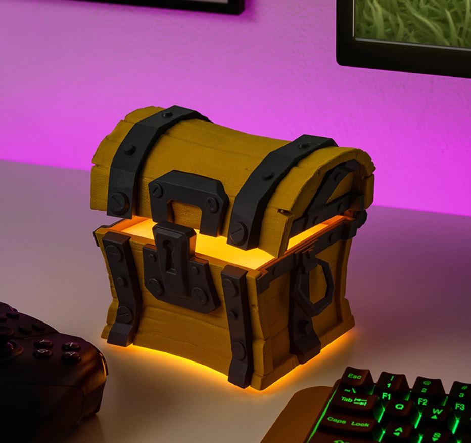 Give yourself a taste of the Fortnite universe with this Fortnite Chest Light. The light is a perfect replica of the game's iconic loot chest, complete with a glowing treasure light that activates when the chest is opened. To create an even more immersive experience, the light also plays authentic sounds from the game's world when you open it, making this the ultimate collectible for fans of the Battle Royale. The lamp is 14.4 cm wide and is powered by three AAA batteries, making it easy to place anywhere in the home. No cord is required, making it as convenient as it is stylish to integrate into your gaming corner or children's room.