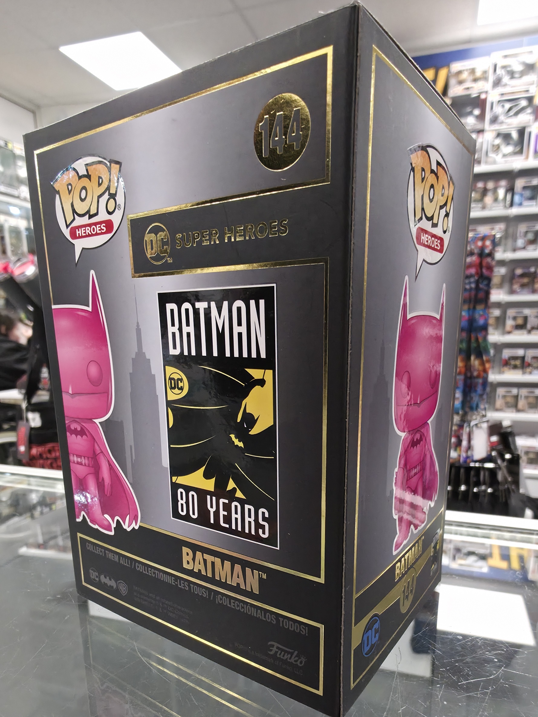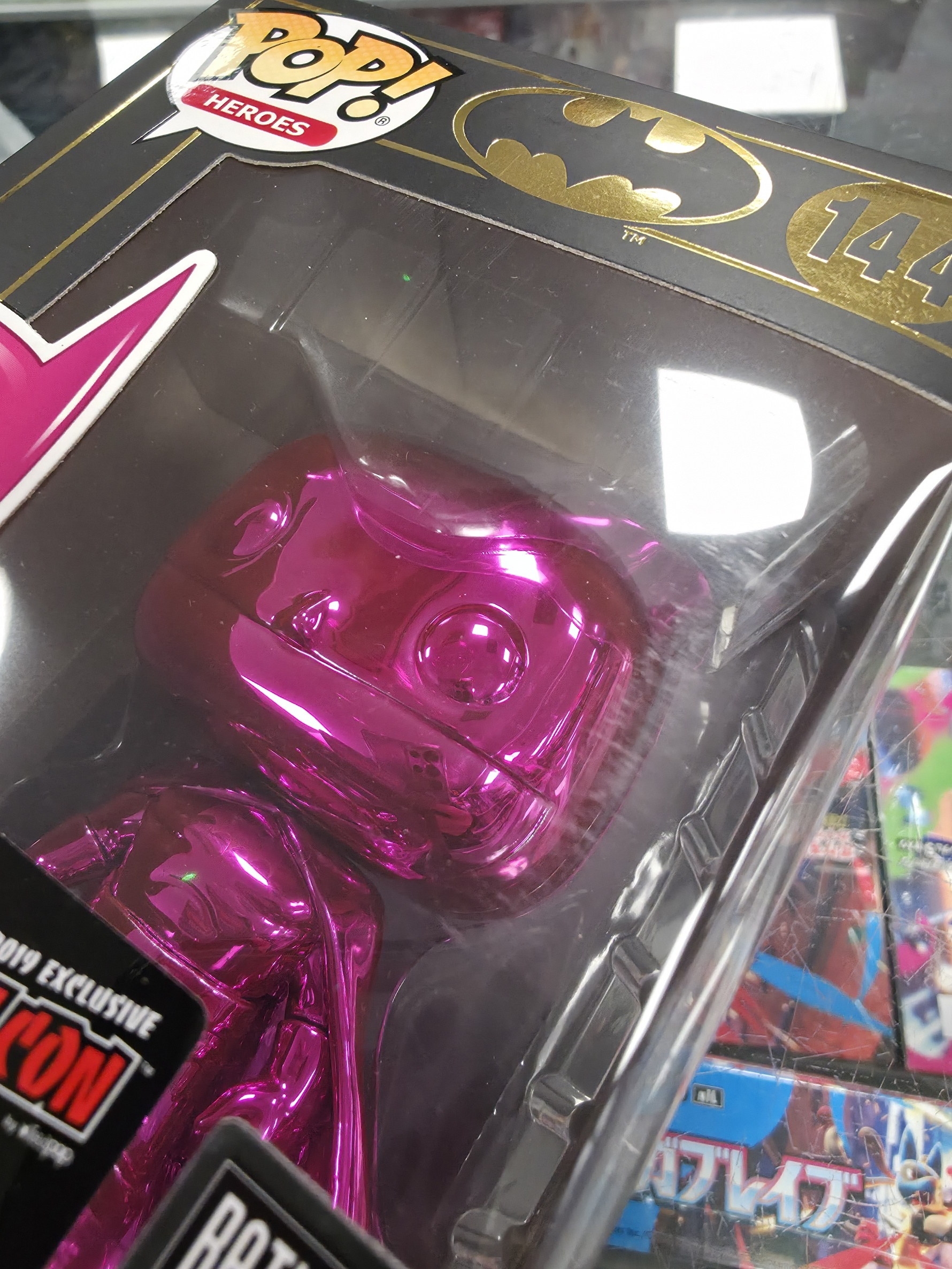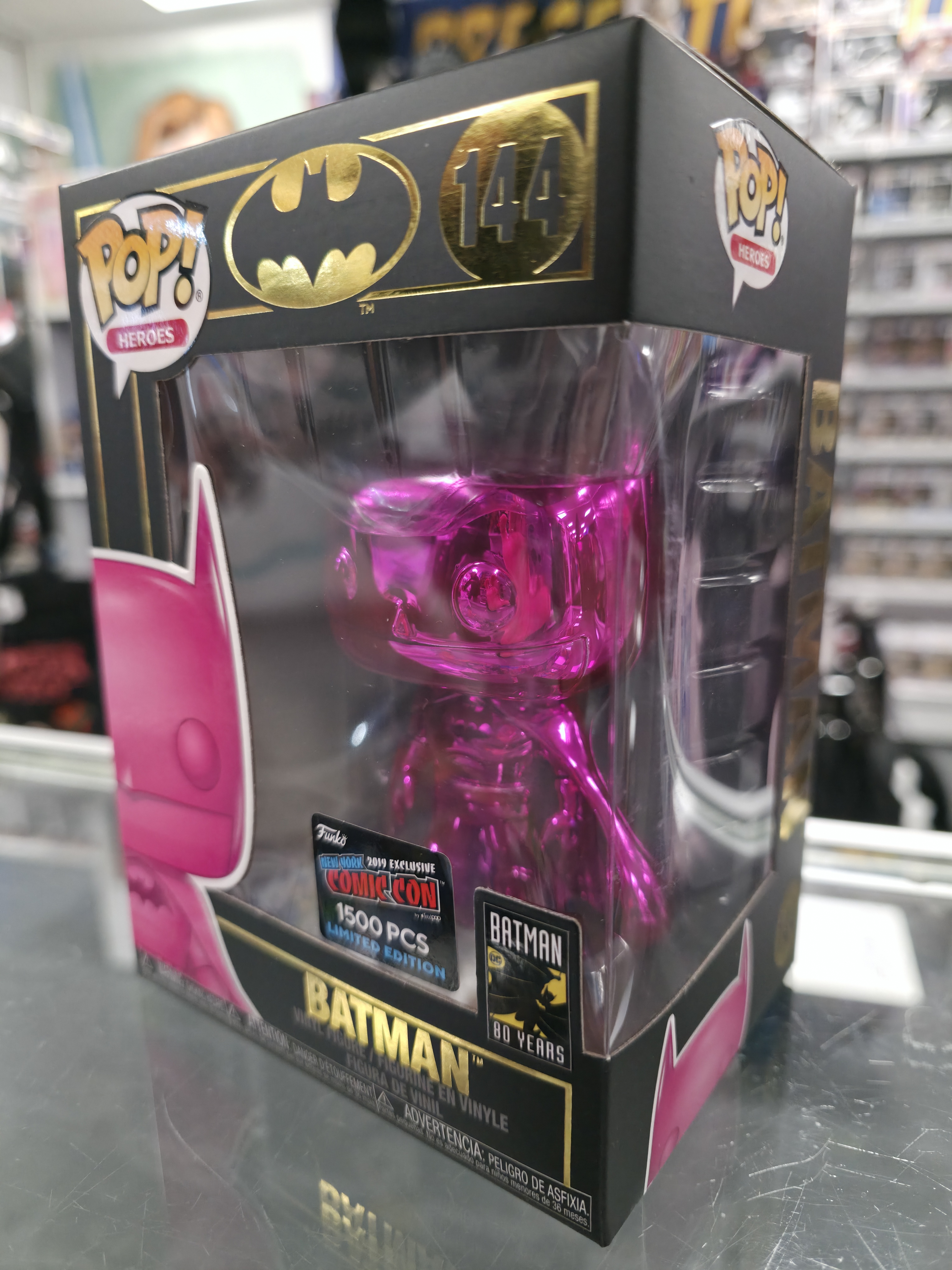This Pre Loved Batman Pink Chrome 144 1500pc NYCC Funko POP! Vinyl Figure comes packaged in its original window display box and it's in good condition.