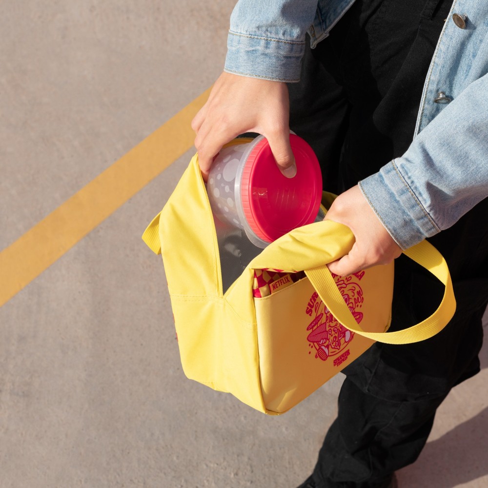 Lunch bag made of polyester. The interior is made and lined with aluminium, which helps to keep food at the right temperature for a while. It has a zip closure, front pocket, side pocket with elastic band for bottles and handles for comfortable carrying. Dimensions: approximately 22 x 23 x 12 cm.