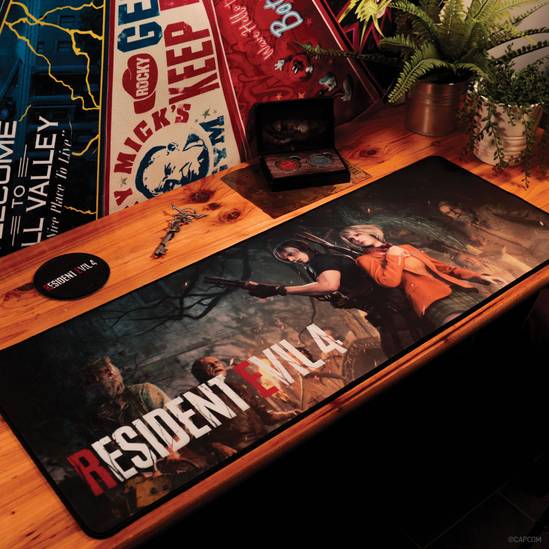 This desk pad features the kidnapped Ashley Graham and her saviour Leon S. Kennedy, and the accompanying coaster details the iconic Resident Evil 4 logo.