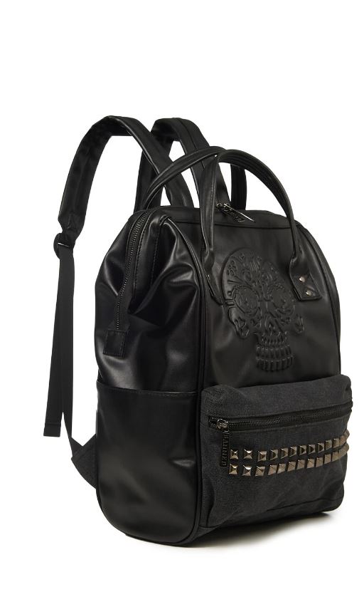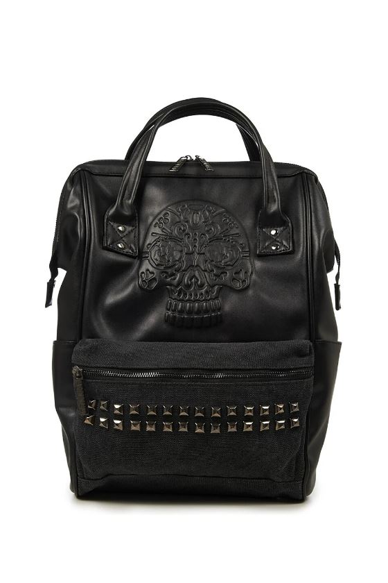 Banned. A black backpack with skull and silver coloured piramid studs on the front