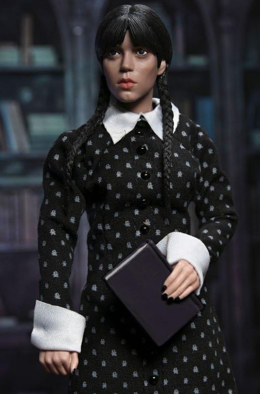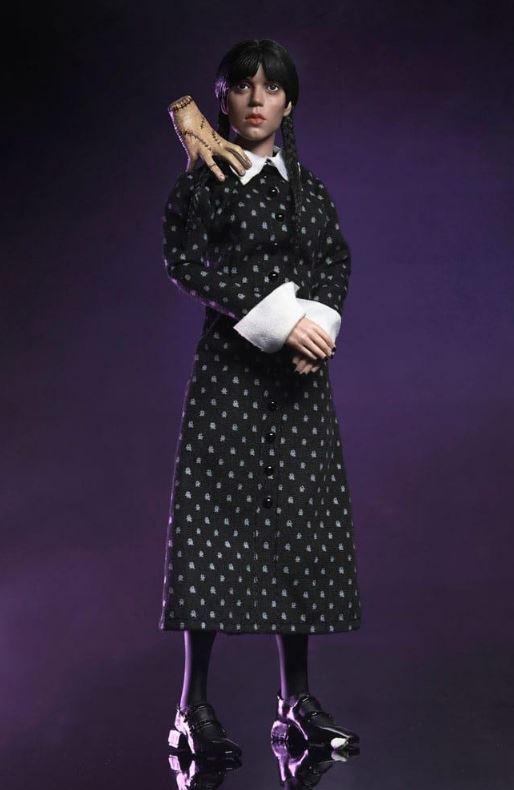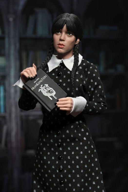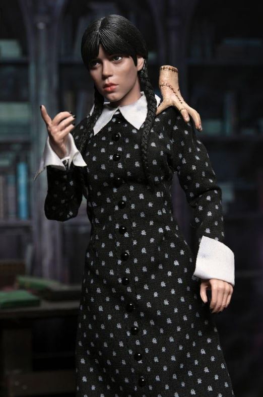 Show off your love for the critically acclaimed Netflix series Wednesday every day of the week with this action figure from NECA! Smart, sarcastic, and a little dead inside, Wednesday Addams finds herself expelled and transferred to Nevermore Academy, a private school for monstrous outcasts. As she adjusts to her strange new environment, she faces murder mysteries, secret societies, local normies, and—worst of all—bright colors. Wearing her classic dress, this fully poseable 8-inch figure features tailored soft goods clothing inspired by vintage toy lines. Accessories include interchangeable hands, Frankenstein book, and her ever-loyal sentient companion: Thing!