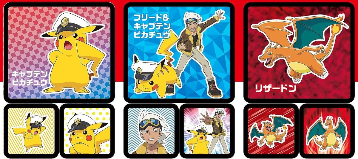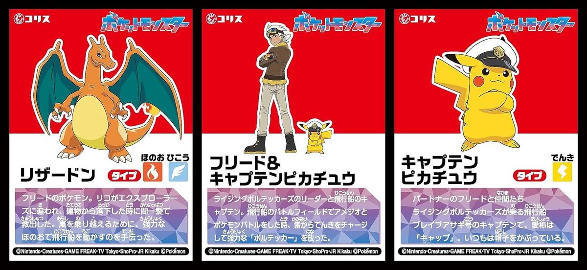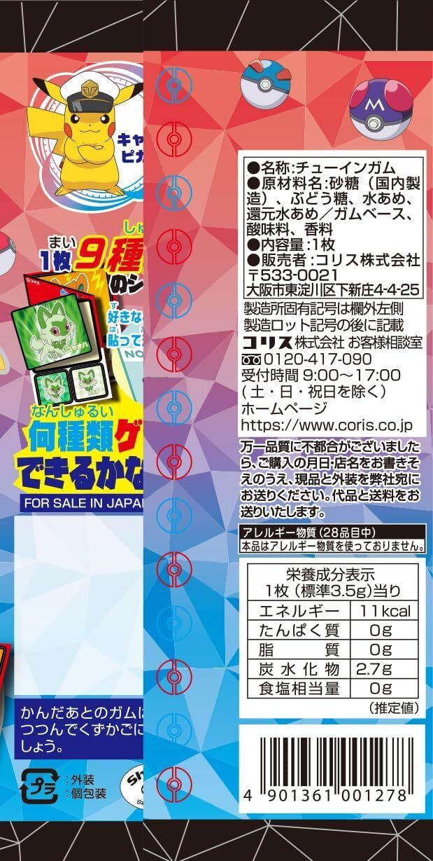 This candy contains stickers and gum featuring characters from “Pokemon.” The front has a sheet of 3 stickers with 9 different designs, and the back includes an original story.
