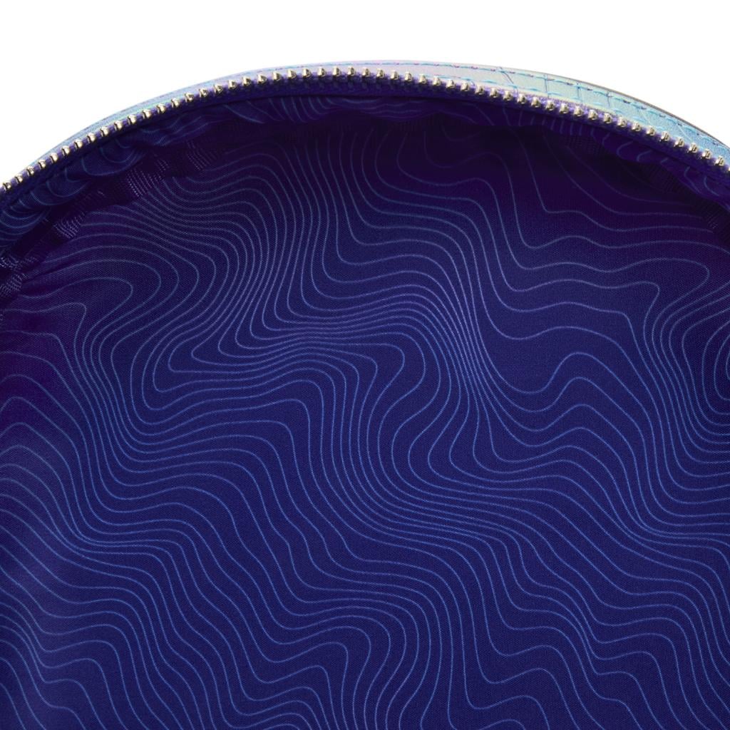 On this bag, you'll find iridescent appliques of Rumi, Mira, and Zoey. Purple highlights the side pockets, zipper, and straps. Star appliques are also on the straps. Attached to the bag is a photo card bag charm with three cards, one for Rumi, one for Mira, and one for Zoey. There's also a beaded charm attached with charms of a heart, bell, and turtle.